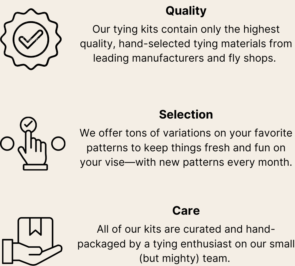 Every Fly Sci kit is expertly-curated with care in our small shop in the U.S., and packed with top-tier materials that fly tiers trust. No generic substitutions. No waste. Just high-quality ingredients for the flies you want to tie.